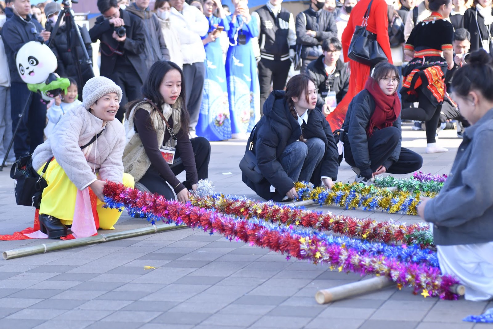 春祭りはグルメや芸術を楽しむだけの場所ではありません。人々が繋がり、語り合い、様々なアクティビティを体験する貴重な機会でもあります。ロト(Lô tô)や袋跳び(nhảy bao bố)、バンブーダンス(nhảy sạp)などの伝統的な遊びのエリアには多くの人が参加し、会場は一体感のある熱気に包まれました。